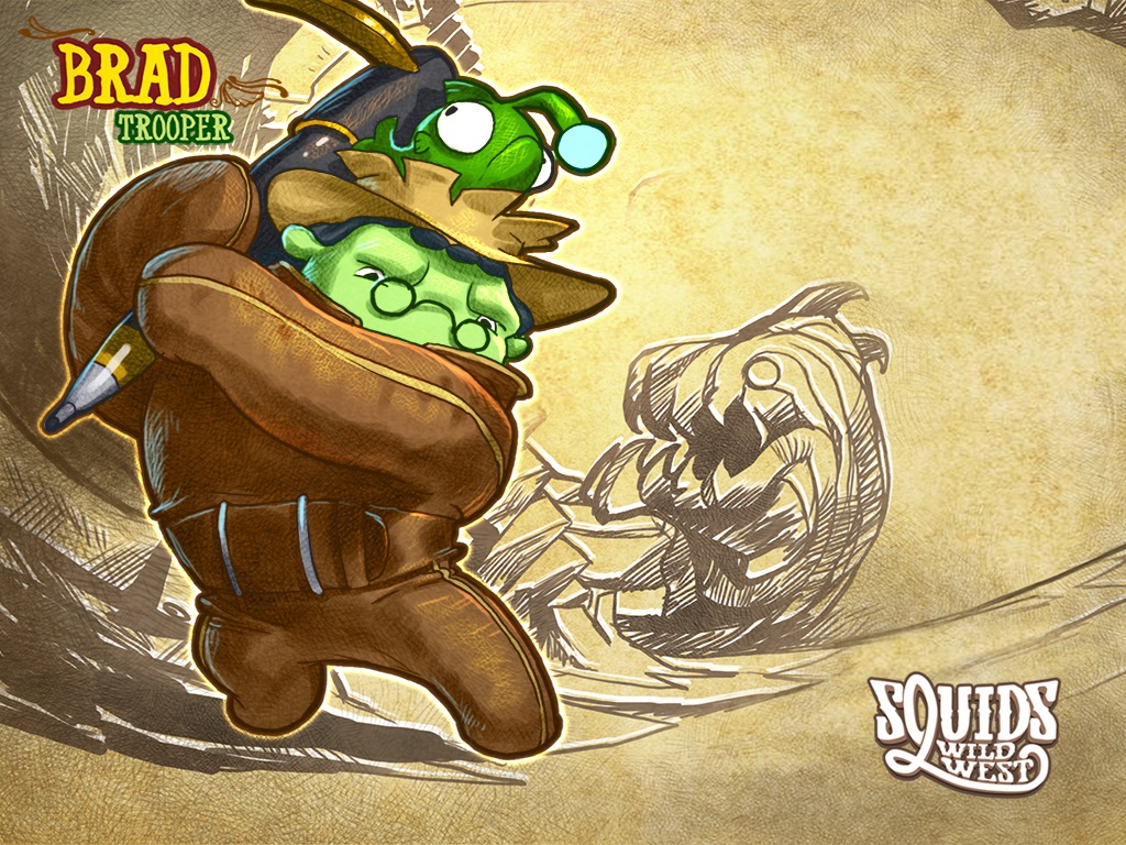 As a teaser for the update coming very soon… the last hero reveal: Magnus. Magnus was the most famous gladiator in all of Thalas, champion of the arena, undefeated for several years, he entertained the whole kingdom with the most epic fights and the most enjoyable shows. Magnus did not leave the city wen Baron took it over. Oh no, Magnus staid. And even the quake that followed the heroes return to Thalas was not enough to make him even think about leaving. Magnus intends to push back the dark blood from his city’s belly and restore her past glory. And you know what? He might very well be able to do it! Because Magnus is a Trooper, and we could say (he would certainly say it), Magnus is “the” Trooper. He is very strong, very heavy, with several stomps that inflict major damage and push enemies far. Emeric put him in his team for the Pro Mode, that tells everything! > No Magnus wallpapers but you can enjoy very nice wallpapers inspired from the Main menu art. Download Squids Wild West wallpapers (for desktop computers, iPhones and iPad – .zip). They look like this: Brad Plainview: Brad has big plans for the West, he dreams of building houses, schools and shops and turn Seawood into a flourishing kingdom. He just met someone who is giving him a lot of pearls to go dig very deep in the cursed mine, and get the black gold flowing… Brad is a trooper. Even though he cannot push ennemies as far as Sammo, he has a double stomp attack, which makes him very efficient against many ennemies! > Download Brad wallpapers (for desktop computers, iPhones and iPad – .zip).